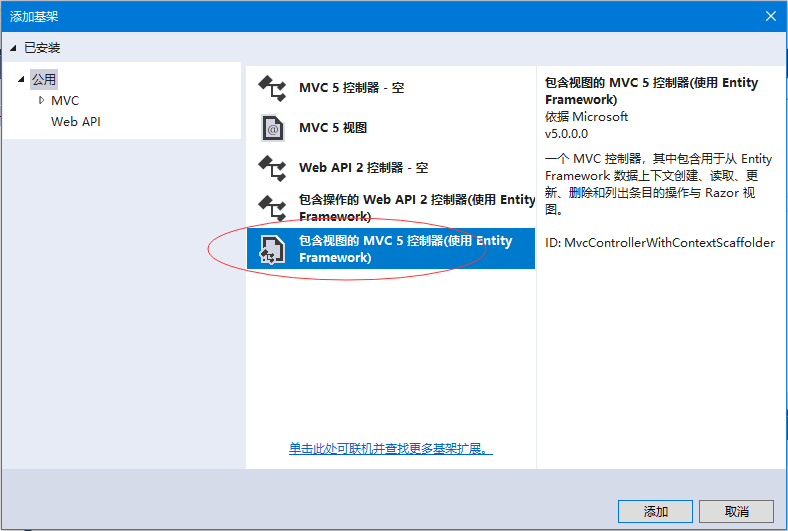 選擇:包含視圖MVC 5控制器(使用Entity Framework) 項(xiàng),然后單擊“添加” 按鈕,這將顯示添加控制器對話框。