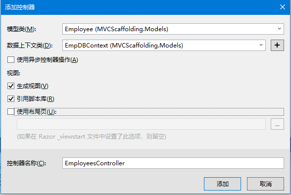 從模型類 下拉列表中選擇:Employee,并從數(shù)據(jù)上下文類 下拉列表中選擇EmpDBContext。還將看到默認(rèn)情況下選擇了控制器名稱。