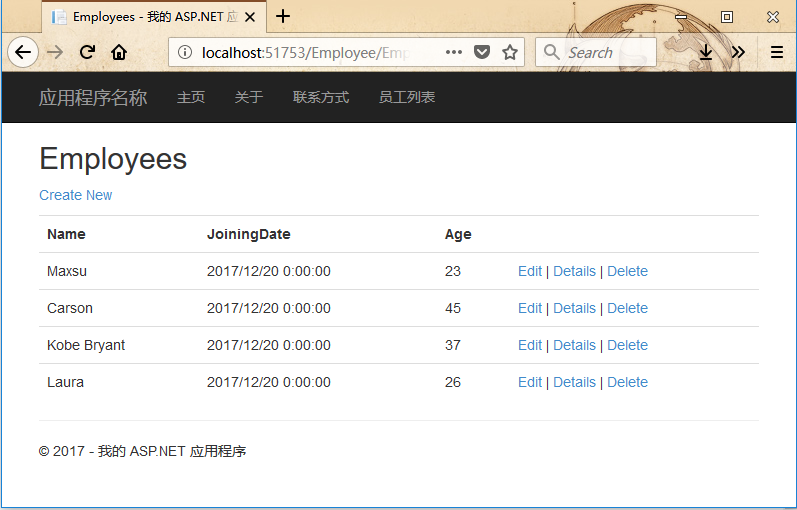 現(xiàn)在需要添加一個鏈接到Employees列表,打開Views/Shared 文件夾下的_layout.cshtml 文件,并在聯(lián)系人 鏈接下面添加員工列表 鏈接。