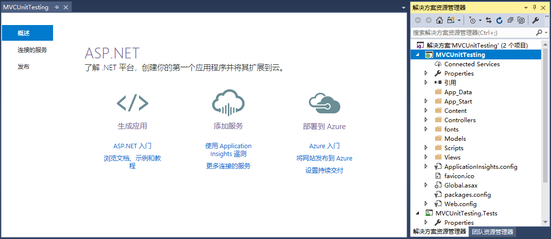 第6步 - 可以看到在解決方案資源管理器中有兩個項目。 一個是ASP.NET Web項目,另一個是單元測試項目。