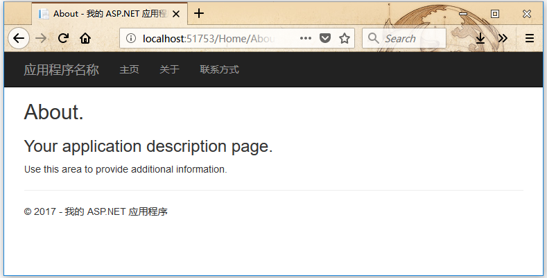 如上圖所示,導(dǎo)航欄上有“首頁”,“關(guān)于”和“聯(lián)系人”按鈕。這里點擊“關(guān)于”鏈接,會看到下面的視圖。