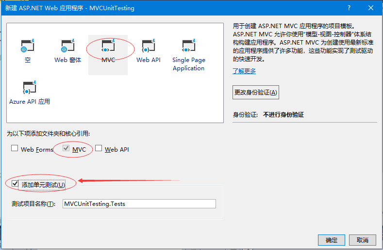 第5步 - 選擇MVC作為模板,不要忘記選中對話框底部的添加單元測試復(fù)選框。也可以更改測試項目名稱,但在此示例中,我們將其保持原樣,因為它是默認名稱。