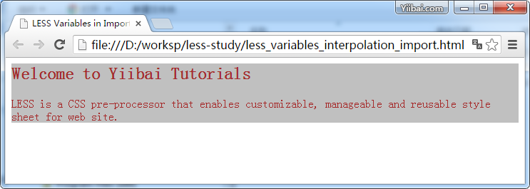 <html> <head> <link rel="stylesheet" href="style.css" type="text/css" /> <title>LESS Variables in Import Statements</title> </head> <body> <div class="myclass"> <h2>Welcome to Yiibai Yiibai</h2> <p>LESS is a CSS pre-processor that enables customizable, manageable and reusable style sheet for web site.</p> </div> </body> </html>