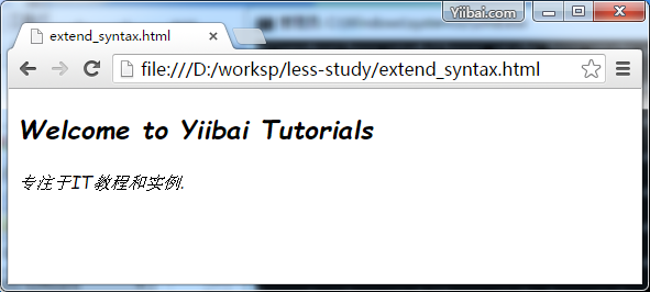 <!doctype html> <head><meta charset="UTF-8"> <link rel="stylesheet" href="style.css" type="text/css" /> </head> <body> <div class="cont"> <h2>Welcome to Yiibai Yiibai</h2> <p>專(zhuān)注于IT教程和實(shí)例.</p> </div> </body> </html>