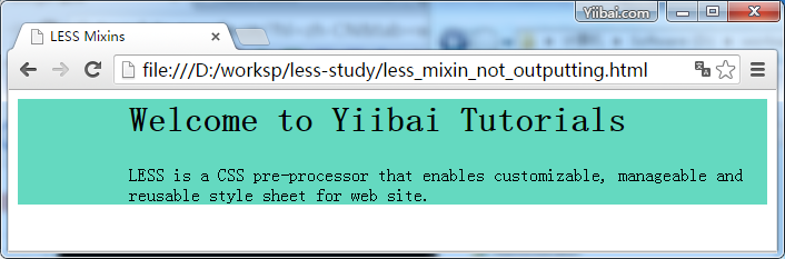 <html> <head> <link rel="stylesheet" href="style.css" type="text/css" /> <title>LESS Mixins</title> </head> <body> <div class="myclass"> <h1>Welcome to Yiibai Yiibai</h1> <p>LESS is a CSS pre-processor that enables customizable, manageable and reusable style sheet for web site.</p> </div> </body> </html>