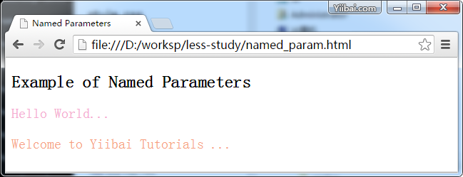 <!doctype html> <head> <title>Named Parameters</title> <link rel="stylesheet" href="style.css" type="text/css" /> </head> <body> <h2>Example of Named Parameters</h2> <p class="class1">Hello World...</p> <p class="class2">Welcome to Yiibai Yiibai ...</p> </body> </html>