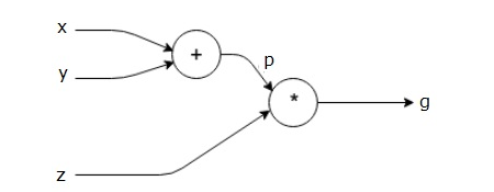 上面的計算圖具有一個加法節(jié)點(具有“+”符號的節(jié)點),其具有兩個輸入變量x和y以及一個輸出q。