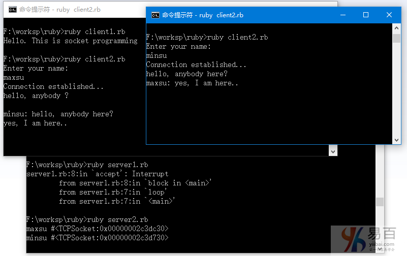 下面顯示兩個(gè)客戶(hù)端之間的聊天消息,首先執(zhí)行(ruby server2.rb),然后再運(yùn)行兩個(gè)客戶(hù)端,在兩個(gè)客戶(hù)端之間發(fā)送信息聊天。