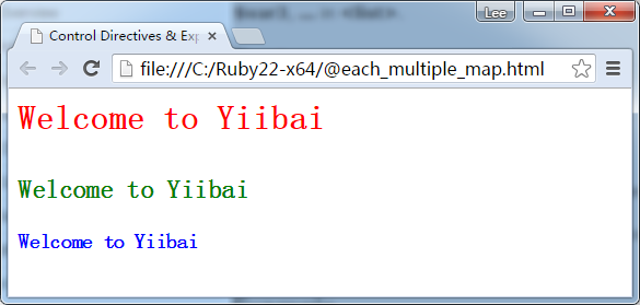 <html> <head> <title>Control Directives & Expressions</title> <link rel="stylesheet" type="text/css" href="style.css"/> </head> <body> <h1>Welcome to Yiibai</p> <h2>Welcome to Yiibai</p> <h3>Welcome to Yiibai</p> </body> </html>