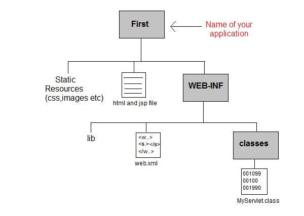 Sun Microsystem定義了創(chuàng)建servlet應(yīng)用程序必須遵循的目錄結(jié)構(gòu)。這里以一個(gè)名稱為:First 的應(yīng)用為示例,介紹一個(gè)典型servlet應(yīng)用程序的目錄結(jié)構(gòu) -