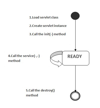 如上圖所示,servlet有三種狀態(tài):新,就緒和結(jié)束。 如果servlet實例被創(chuàng)建,則servlet處于新狀態(tài)。 調(diào)用init()方法后,Servlet進(jìn)入就緒狀態(tài)。 在就緒狀態(tài)下,servlet執(zhí)行所有任務(wù)。當(dāng)web容器調(diào)用destroy()方法時,它轉(zhuǎn)移到結(jié)束狀態(tài)。