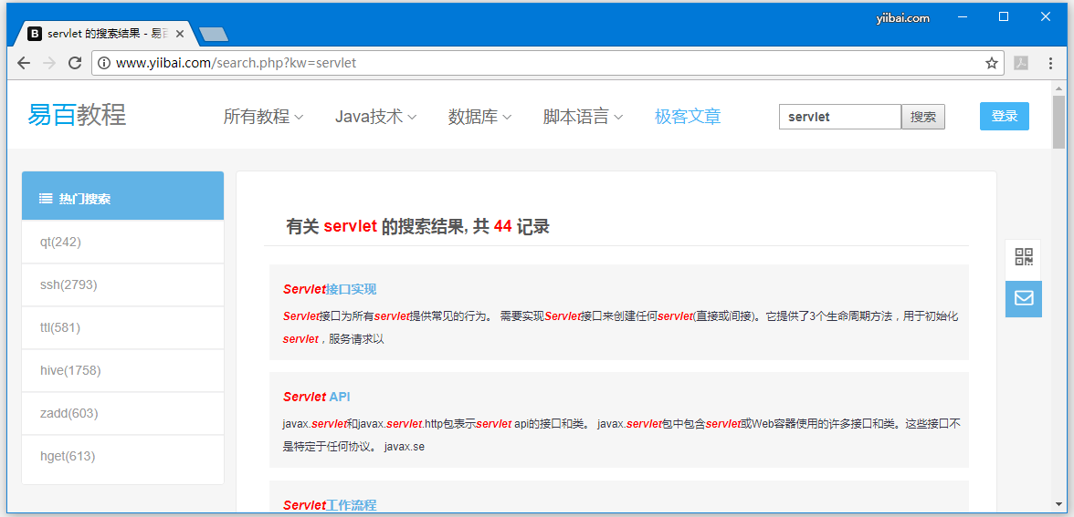 點(diǎn)擊搜索按鈕后,重定向到易百教程的搜索頁(yè)面并搜索指定關(guān)鍵字:servlet,得到以下結(jié)果 -