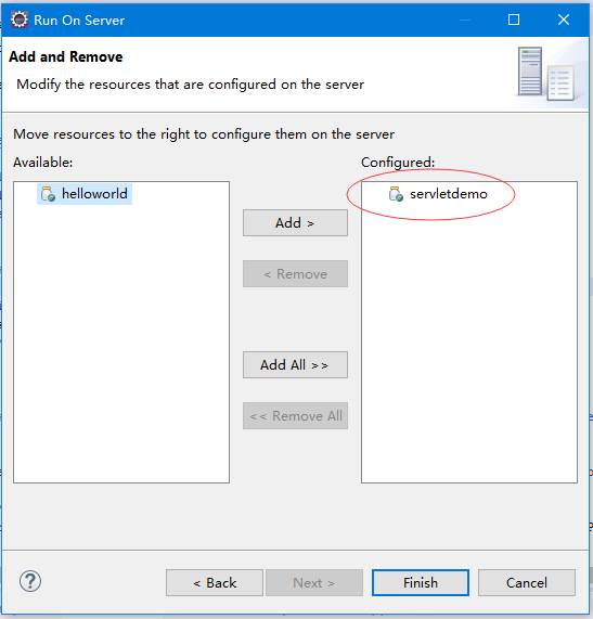 要啟動服務器并部署項目,首先右鍵單擊項目(servletdemo) -> Run As -> Run on Server -> 選擇tomcat服務器 -> 下一步 - > addAll -> 完成。