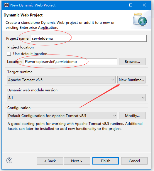 在彈出的向?qū)υ捒蛑?,填寫項目名稱:servletdemo,并選擇項目的存儲目錄位置為:F:\worksp\servlet\servletdemo,如果沒有運行時環(huán)境(Target runtime),可自己新建一個。然后點擊下一步(Next>),如下所示 -