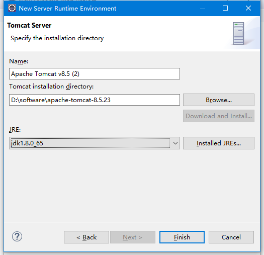 選擇Tomcat服務器的安裝目錄以及它的名稱,還要指定JRE配置,如下所示 -