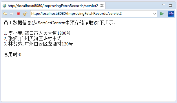 在編寫上面代碼后,部署此Web應(yīng)用程序(在項(xiàng)目名稱上點(diǎn)擊右鍵->”Run On Server…”),打開瀏覽器訪問URL: http://localhost:8080/ImprovingFetchRecords/ ,如果沒有錯(cuò)誤,應(yīng)該會(huì)看到以下結(jié)果 -