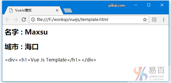 如果查看瀏覽器,我們會(huì)看到內(nèi)容的添加方式與在.js文件中定義的變量htmlcontent相同:"<div><h1>Vue Js Template</h1></div>"。