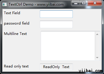self.t1 = wx.TextCtrl(panel) self.t2 = wx.TextCtrl(panel,style = wx.TE_PASSWORD) self.t3 = wx.TextCtrl(panel,size = (200,100),style = wx.TE_MULTILINE) self.t4 = wx.TextCtrl ( panel, value = "ReadOnly Text", style = wx.TE_READONLY | wx.TE_CENTER )