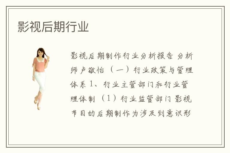 影視后期制作行業(yè)分析報(bào)告 分析師盧敬怡 (一)行業(yè)政策與管理體系 1、行業(yè)主管部門(mén)和行業(yè)管理體制 (1)行業(yè)監(jiān)管部門(mén) 影視節(jié)目的后期制作為涉及到意識(shí)形態(tài)的傳播的特殊