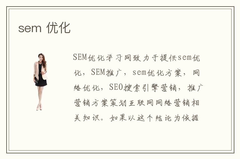 SEM優(yōu)化學(xué)習(xí)網(wǎng)致力于提供sem優(yōu)化,SEM推廣,sem優(yōu)化方案,網(wǎng)絡(luò)優(yōu)化,SEO搜索引擎營銷,推廣營銷方案策劃互聯(lián)網(wǎng)網(wǎng)絡(luò)營銷相關(guān)知識。