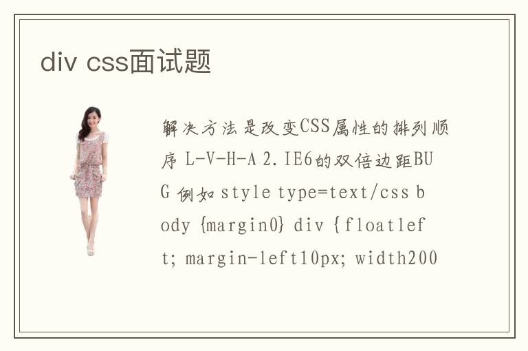 解決方法是改變CSS屬性的排列順序 L-V-H-A 2.IE6的雙倍邊距BUG 例如 <style type="text/css"> body {margin0} div { floatleft; margin-left10px; width200px; height200px;