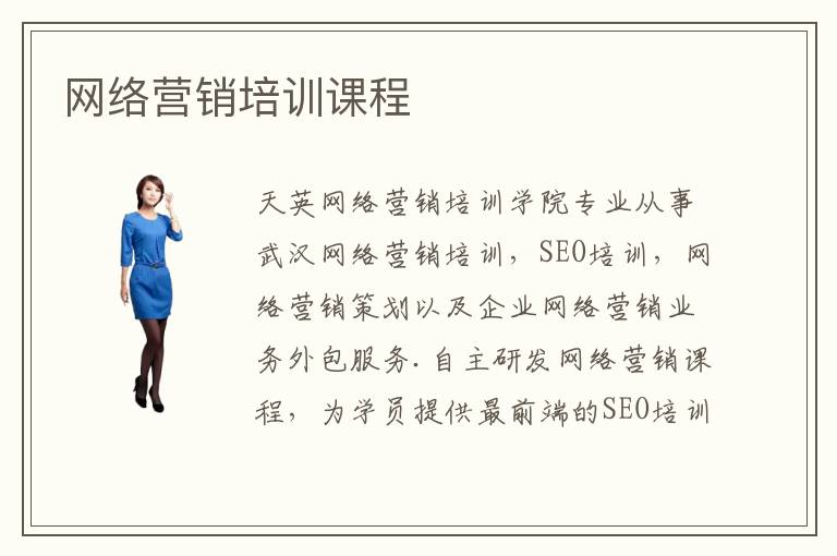 天英網(wǎng)絡(luò)營(yíng)銷培訓(xùn)學(xué)院專業(yè)從事武漢網(wǎng)絡(luò)營(yíng)銷培訓(xùn),SEO培訓(xùn),網(wǎng)絡(luò)營(yíng)銷策劃以及企業(yè)網(wǎng)絡(luò)營(yíng)銷業(yè)務(wù)外包服務(wù).自主研發(fā)網(wǎng)絡(luò)營(yíng)銷課程,為學(xué)員提供最前端的SEO培訓(xùn)和實(shí)戰(zhàn)網(wǎng)絡(luò)營(yíng)