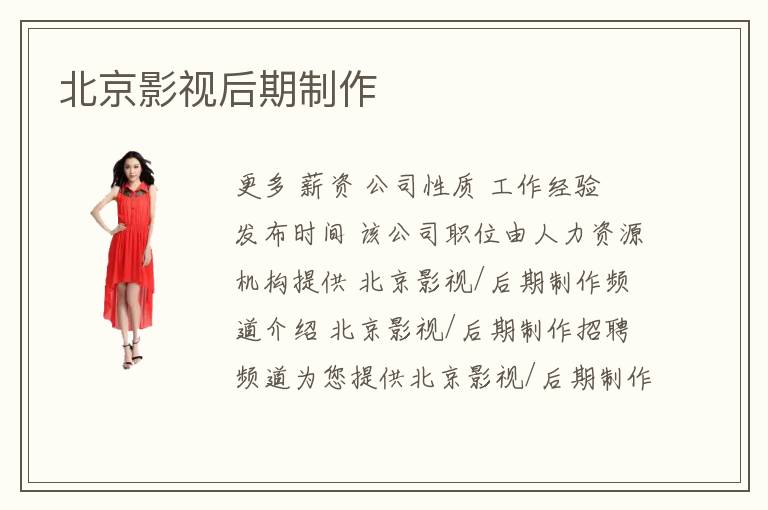 更多 薪資 公司性質(zhì) 工作經(jīng)驗(yàn) 發(fā)布時間 該公司職位由人力資源機(jī)構(gòu)提供 北京影視/后期制作頻道介紹 北京影視/后期制作招聘頻道為您提供北京影視/后期制作招聘信息,在此