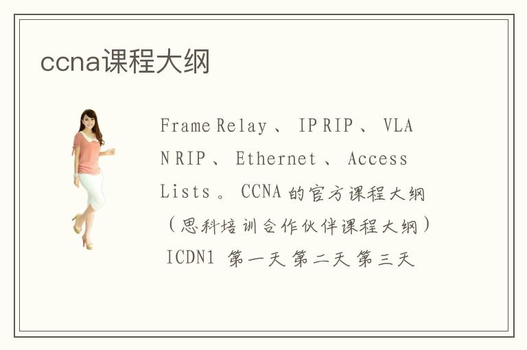 Frame Relay 、 IP RIP 、 VLAN RIP 、 Ethernet 、 Access Lists 。 CCNA 的官方課程大綱(思科培訓(xùn)合作伙伴課程大綱) ICDN1 第一天 第二天 第三天 第四天 第五天 上午 組建