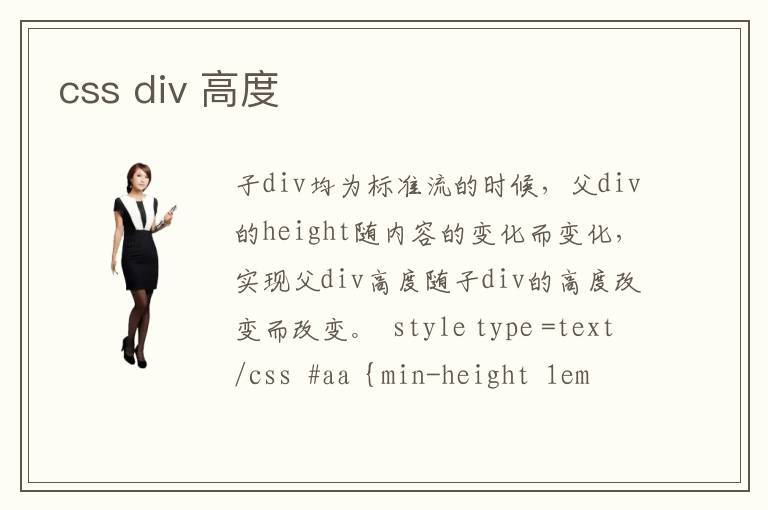 子div均為標(biāo)準(zhǔn)流的時(shí)候,父div的height隨內(nèi)容的變化而變化,實(shí)現(xiàn)父div高度隨子div的高度改變而改變。 < style type ="text/css" > #aa { min-height 1em ; } #bb { height 55px ; }