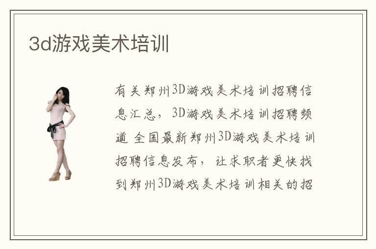 有關(guān)鄭州3D游戲美術(shù)培訓(xùn)招聘信息匯總,3D游戲美術(shù)培訓(xùn)招聘頻道 全國最新鄭州3D游戲美術(shù)培訓(xùn)招聘信息發(fā)布,讓求職者更快找到鄭州3D游戲美術(shù)培訓(xùn)相關(guān)的招聘職位和招聘