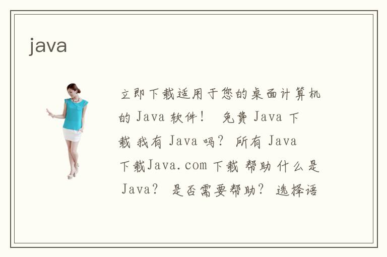 立即下載適用于您的桌面計算機的 Java 軟件! 免費 Java 下載 我有 Java 嗎? 所有 Java 下載Java.com 下載 幫助 什么是 Java? 是否需要幫助? 選擇語言 關(guān)于 Java 支持 開發(fā)人員