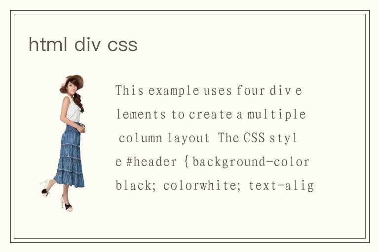 This example uses four <div> elements to create a multiple column layout The CSS <style> #header { background-colorblack; colorwhite; text-aligncenter;