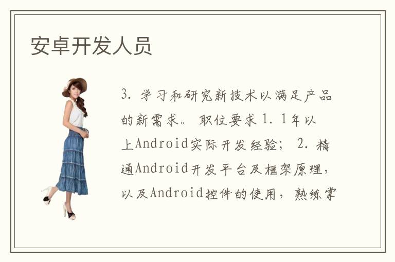 3. 學習和研究新技術以滿足產(chǎn)品的新需求。 職位要求 1. 1年以上Android實際開發(fā)經(jīng)驗; 2. 精通Android開發(fā)平臺及框架原理,以及Android控件的使用,熟練掌握Android界