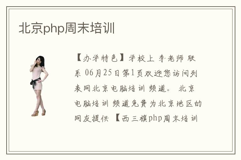 【辦學(xué)特色】學(xué)校上 李老師 聯(lián)系 06月25日第1頁歡迎您訪問列表網(wǎng)北京電腦培訓(xùn) 頻道。 北京電腦培訓(xùn) 頻道免費(fèi)為北京地區(qū)的網(wǎng)友提供 【西三旗php周末培訓(xùn)】_ 等電腦培訓(xùn)信