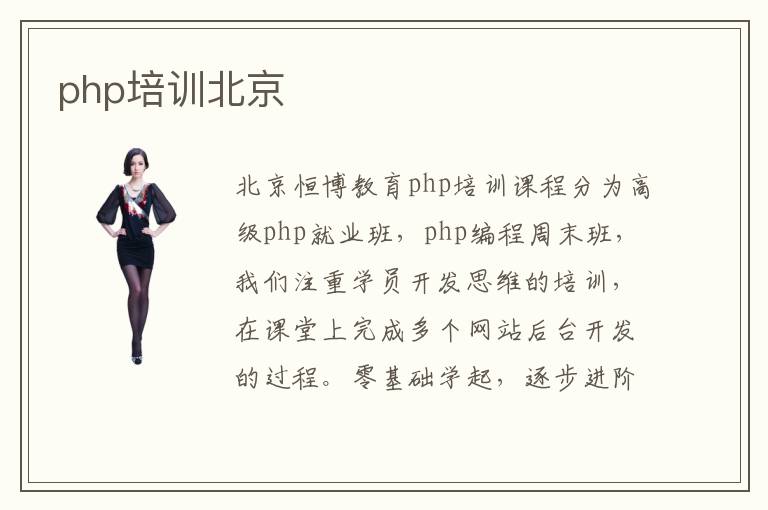 北京恒博教育php培訓(xùn)課程分為高級(jí)php就業(yè)班,php編程周末班,我們注重學(xué)員開(kāi)發(fā)思維的培訓(xùn),在課堂上完成多個(gè)網(wǎng)站后臺(tái)開(kāi)發(fā)的過(guò)程。零基礎(chǔ)學(xué)起,逐步進(jìn)階