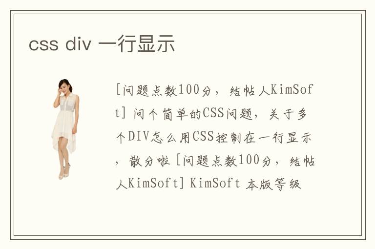 [問(wèn)題點(diǎn)數(shù)100分,結(jié)帖人KimSoft] 問(wèn)個(gè)簡(jiǎn)單的CSS問(wèn)題,關(guān)于多個(gè)DIV怎么用CSS控制在一行顯示,散分啦 [問(wèn)題點(diǎn)數(shù)100分,結(jié)帖人KimSoft] KimSoft 本版等級(jí) 本版專家分