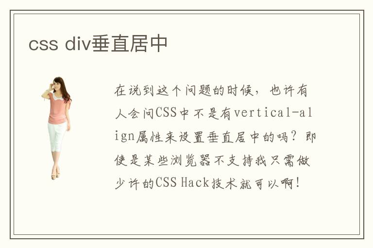 在說到這個問題的時候,也許有人會問CSS中不是有vertical-align屬性來設(shè)置垂直居中的嗎?即使是某些瀏覽器不支持我只需做少許的CSS Hack技術(shù)就可以??!所以在這里我還要
