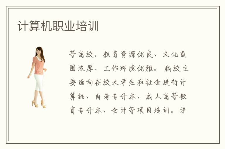 等高校。教育資源優(yōu)良、文化氛圍濃厚、工作環(huán)境優(yōu)雅。 我校主要面向在校大學(xué)生和社會(huì)進(jìn)行計(jì)算機(jī)、自考專升本、成人高等教育專升本、會(huì)計(jì)等項(xiàng)目培訓(xùn)。學(xué)校遵循“教書育人、