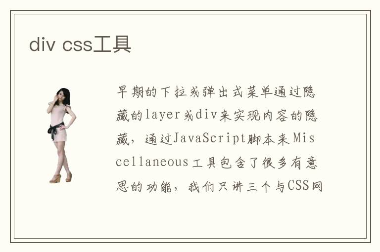 早期的下拉或彈出式菜單通過隱藏的layer或div來實(shí)現(xiàn)內(nèi)容的隱藏,通過JavaScript腳本來 Miscellaneous工具包含了很多有意思的功能,我們只講三個與CSS網(wǎng)頁布局開發(fā)有關(guān)系