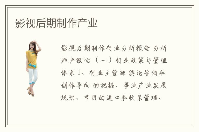 影視后期制作行業(yè)分析報告 分析師盧敬怡 (一)行業(yè)政策與管理體系 1、行業(yè)主管部 輿論導(dǎo)向和創(chuàng)作導(dǎo)向 的把握、事業(yè)產(chǎn)業(yè)發(fā)展規(guī)劃、節(jié)目的進口和收錄管理、活動宣傳交流