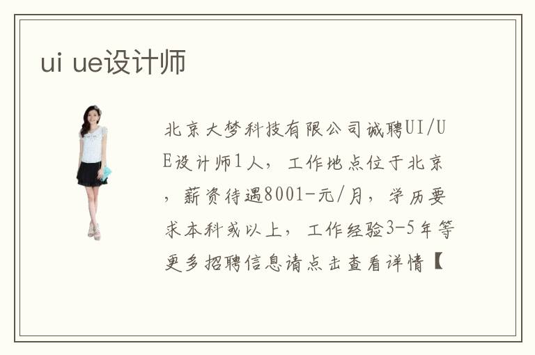 北京大夢科技有限公司誠聘UI/UE設(shè)計師1人,工作地點位于北京,薪資待遇8001-元/月,學歷要求本科或以上,工作經(jīng)驗3-5年等更多招聘信息請點擊查看詳情【智聯(lián)招聘,為