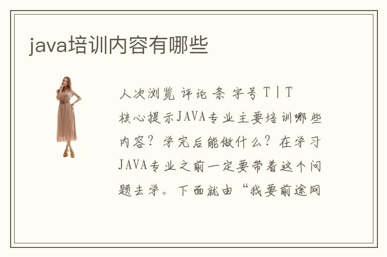 人次瀏覽 評論 條 字號 T | T 核心提示JAVA專業(yè)主要培訓(xùn)哪些內(nèi)容?學(xué)完后能做什么?在學(xué)習(xí)JAVA專業(yè)之前一定要帶著這個問題去學(xué)。下面就由“我要前途網(wǎng) JAVA專業(yè)主要培