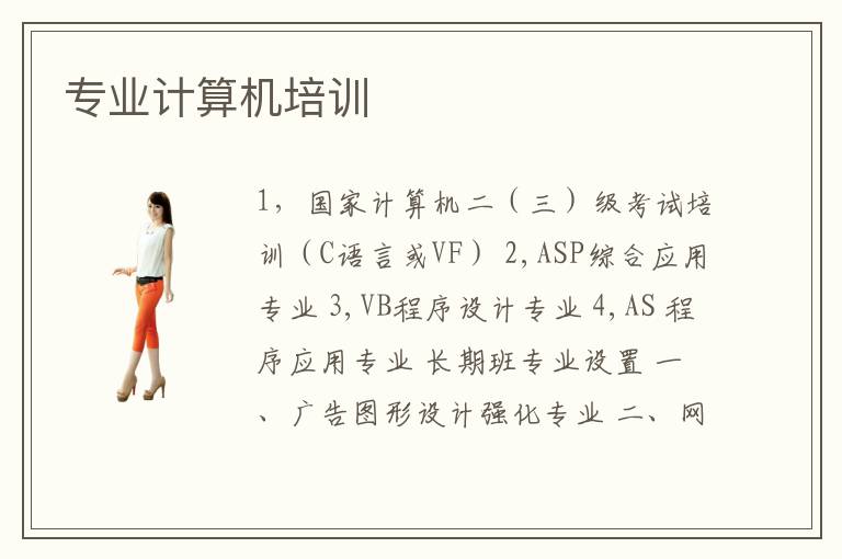 1,國(guó)家計(jì)算機(jī)二(三)級(jí)考試培訓(xùn)(C語(yǔ)言或VF) 2,ASP綜合應(yīng)用專業(yè) 3,VB程序設(shè)計(jì)專業(yè) 4,AS 程序應(yīng)用專業(yè) 長(zhǎng)期班專業(yè)設(shè)置 一、廣告圖形設(shè)計(jì)強(qiáng)化專業(yè) 二、網(wǎng)絡(luò)組建與管理