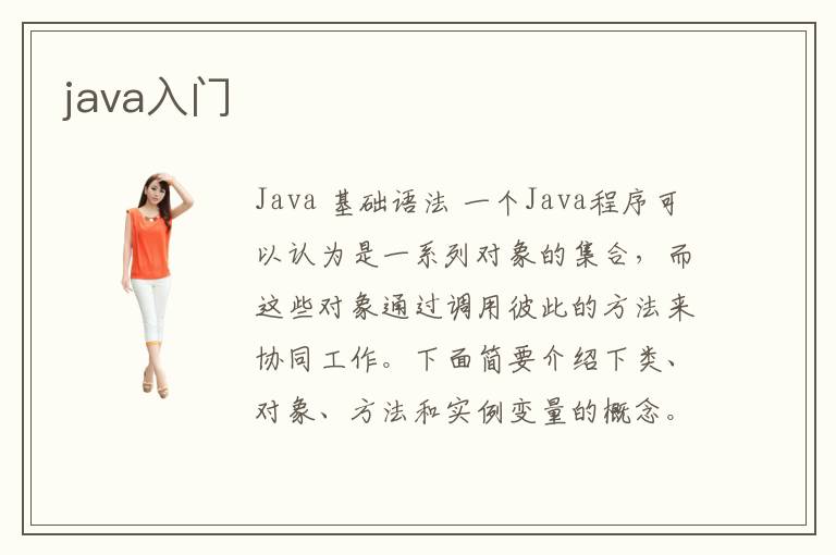 Java 基礎(chǔ)語法 一個(gè)Java程序可以認(rèn)為是一系列對(duì)象的集合,而這些對(duì)象通過調(diào)用彼此的方法來協(xié)同工作。下面簡(jiǎn)要介紹下類、對(duì)象、方法和實(shí)例變量的概念。 對(duì)象對(duì)象是類的一