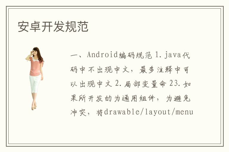 一、Android編碼規(guī)范 1.java代碼中不出現(xiàn)中文,最多注釋中可以出現(xiàn)中文 2.局部變量命 23.如果所開發(fā)的為通用組件,為避免沖突,將drawable/layout/menu/values目錄下的文件