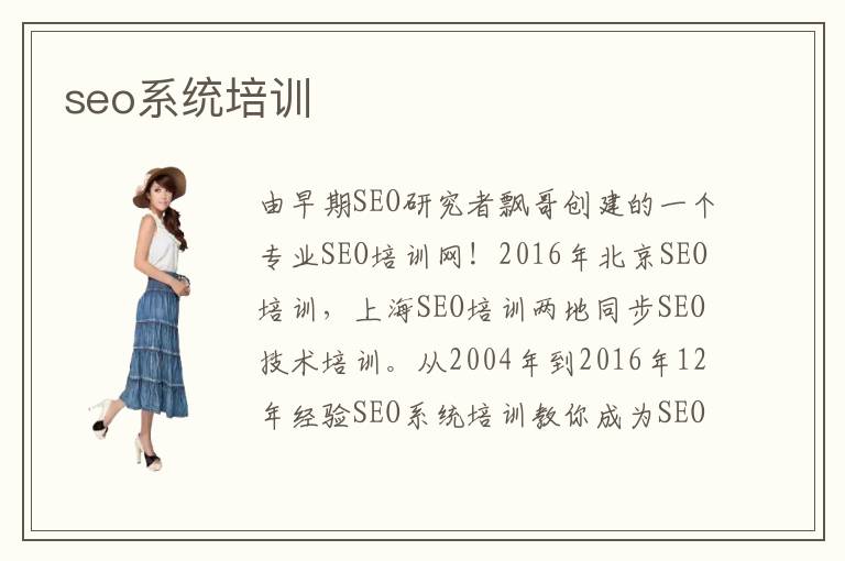 由早期SEO研究者飄哥創(chuàng)建的一個(gè)專業(yè)SEO培訓(xùn)網(wǎng)!2016年北京SEO培訓(xùn),上海SEO培訓(xùn)兩地同步SEO技術(shù)培訓(xùn)。從2004年到2016年12年經(jīng)驗(yàn)SEO系統(tǒng)培訓(xùn)教你成為SEO高手!