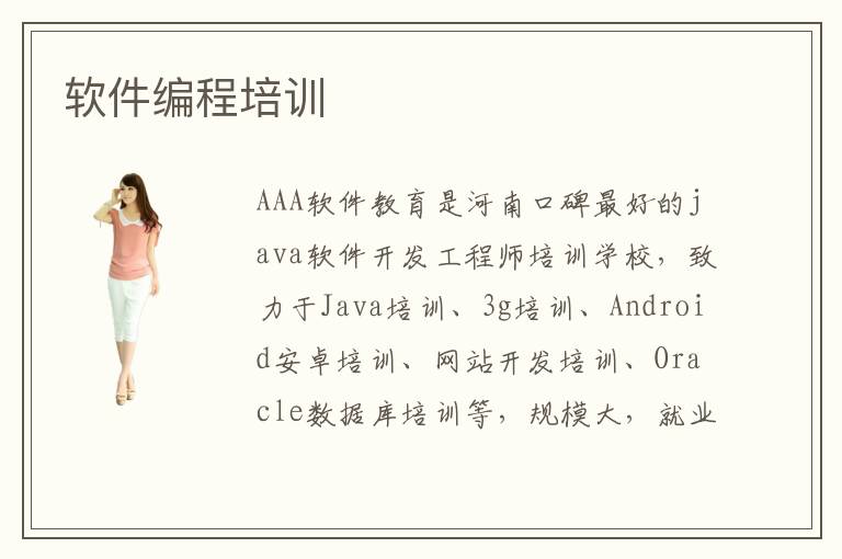 AAA軟件教育是河南口碑最好的java軟件開發(fā)工程師培訓學校,致力于Java培訓、3g培訓、Android安卓培訓、網(wǎng)站開發(fā)培訓、Oracle數(shù)據(jù)庫培訓等,規(guī)模大,就業(yè)強,口碑好,可
