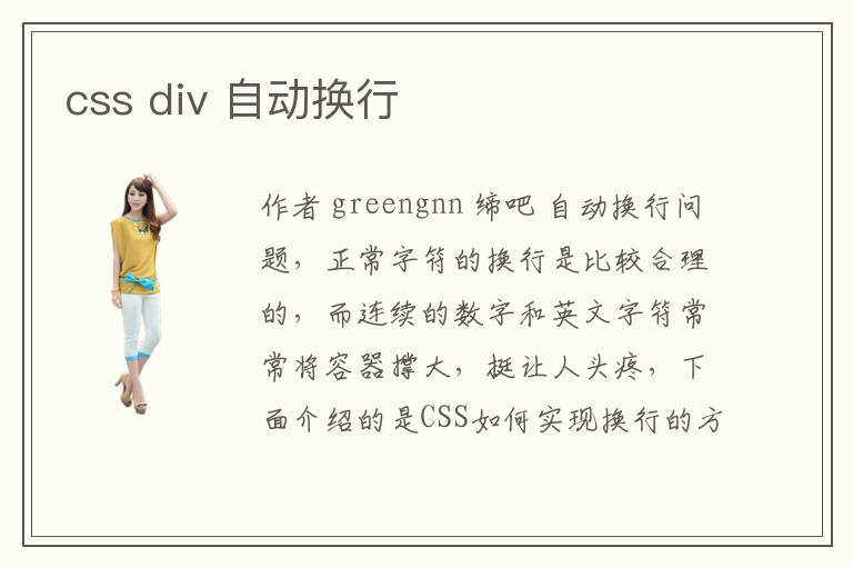 作者 greengnn 締吧 自動(dòng)換行問(wèn)題,正常字符的換行是比較合理的,而連續(xù)的數(shù)字和英文字符常常將容器撐大,挺讓人頭疼,下面介紹的是CSS如何實(shí)現(xiàn)換行的方法 對(duì)于div,p等
