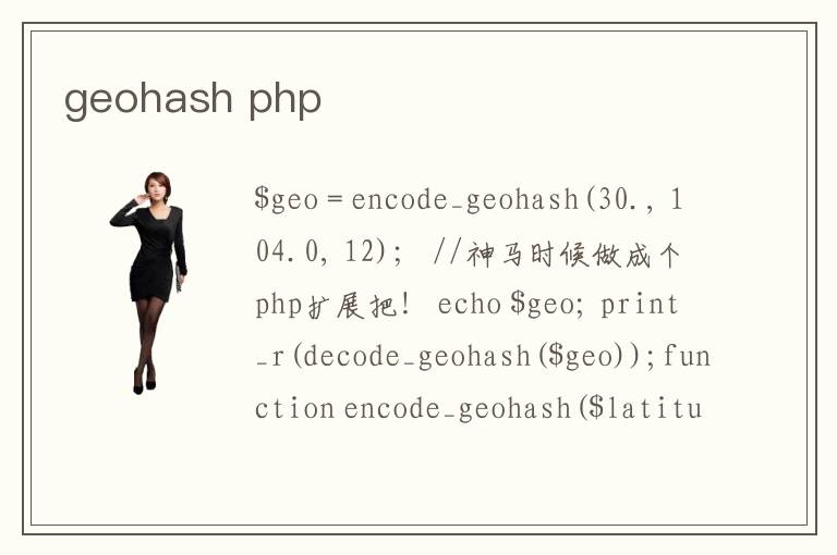 $geo = encode_geohash(30., 104.0, 12); //神馬時候做成個php擴展把! echo $geo; print_r(decode_geohash($geo));function encode_geohash($latitude, $longitude, $
