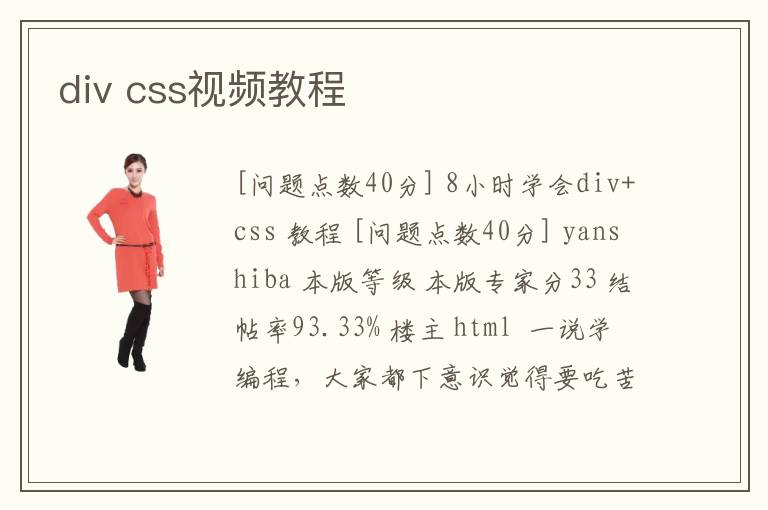 [問題點(diǎn)數(shù)40分] 8小時學(xué)會div+css 教程 [問題點(diǎn)數(shù)40分] yanshiba 本版等級 本版專家分33 結(jié)帖率93.33% 樓主 html 一說學(xué)編程,大家都下意識覺得要"吃苦",